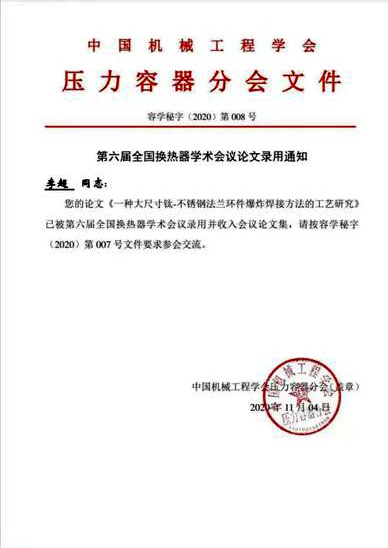 我司研發(fā)部撰寫的論文“一種大尺寸鈦/不銹鋼法蘭環(huán)件爆炸焊接方法的工藝研究"有幸入選會(huì)議論文集,論文作者-我司年輕技術(shù)人員:李超應(yīng)邀參會(huì)交流。