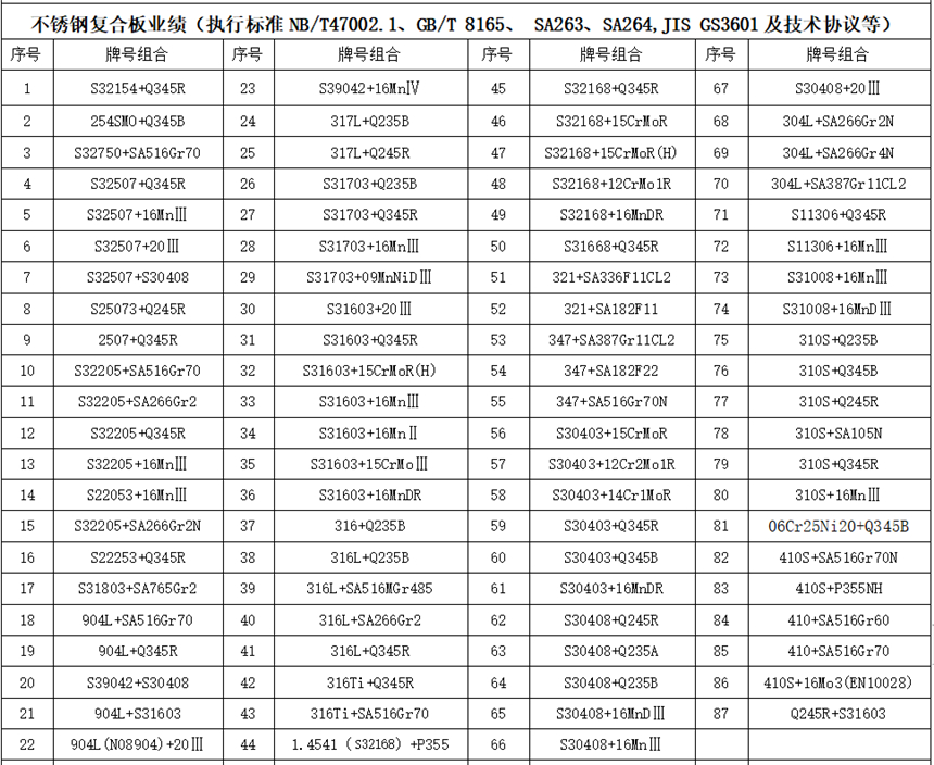不銹鋼復合板執行標準:NB/T47002.1-2019、GB/T 8165-2008、ASME SA263、ASME SA264,JIS GS3601及技術協議等可供規格(常規單板面積<42㎡): (覆層厚度+基層厚度)×寬度×長度 (1.5~16mm+>8mm)×<4000mm×<14000mm