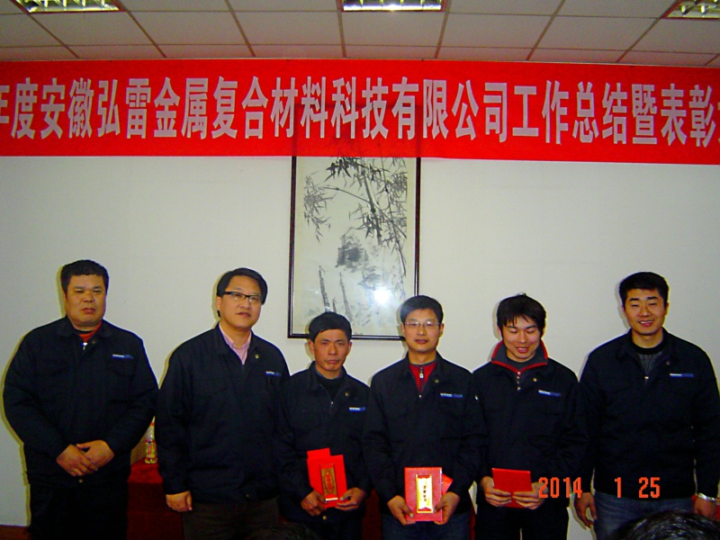 ???? 新春佳節即將到來,在這辭舊迎新之際,公司召開了《安徽弘雷金屬復合材料科技有限公司2013年工作總結暨表彰大會》。大會對過去的2013年工作進行總結,并就2014年公司各項工作進行安排和部署,同時對為公司發展和各項工作做出貢獻的員工進行了表彰和獎勵。