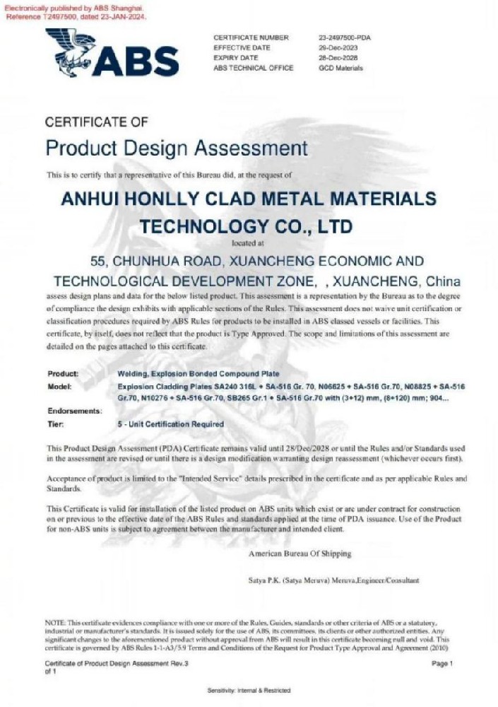 我司ABS認(rèn)證證書覆蓋了ASME SA264,ASME SA265,ASTM B898標(biāo)準(zhǔn)下的不銹鋼-鋼,鎳-鋼,鈦-鋼復(fù)合板。公司將不斷增加研發(fā)投入、持續(xù)創(chuàng)新,一如既往的嚴(yán)格執(zhí)行各項(xiàng)管理體系及規(guī)范規(guī)章的要求,為全球客戶提供值得信賴的爆炸焊接新材料。